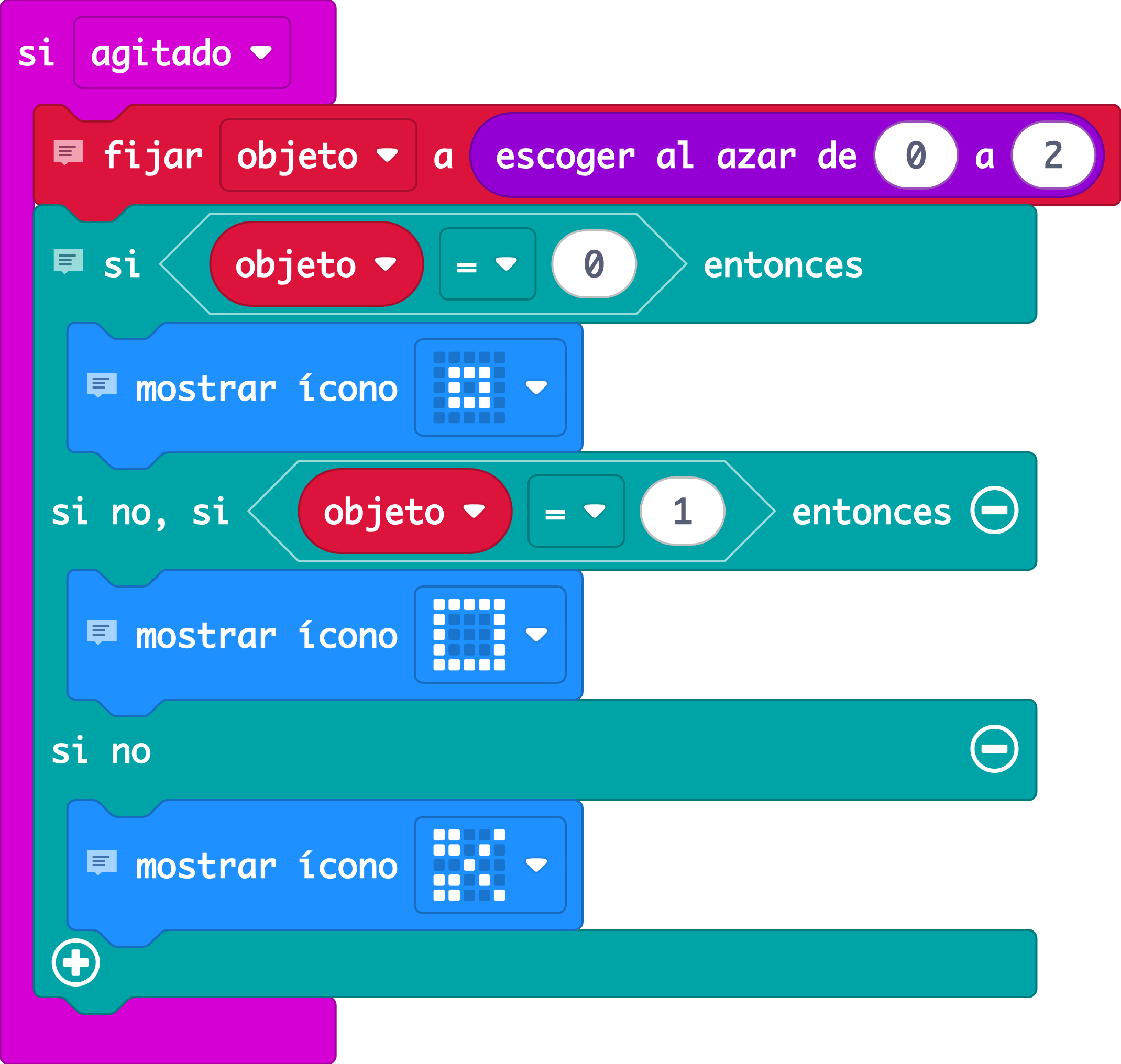 - Dentro del bloque al agitar, usa el bloque establecer objeto a de la categoría Variables.