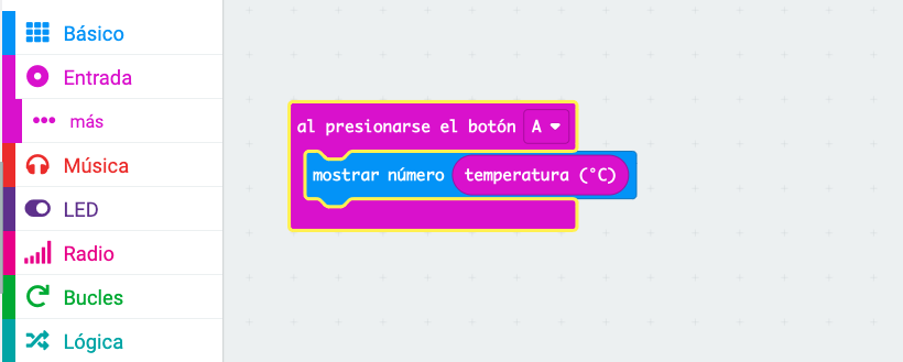 - El bloque temperatura (°C) medirá automáticamente la temperatura ambiente utilizando el sensor interno de la micro:bit
