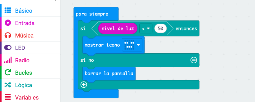 - Cuando el nivel de luz es menor a 50, la micro:bit mostrará un icono de carita dormida en la pantalla LED.