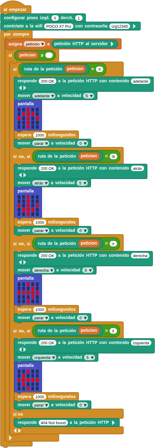 Se trata de controlar el robot a través de un servidor web creado en la microSTEAMakers, en función de la petición get mandada, podemos controlar el movimiento del robot.