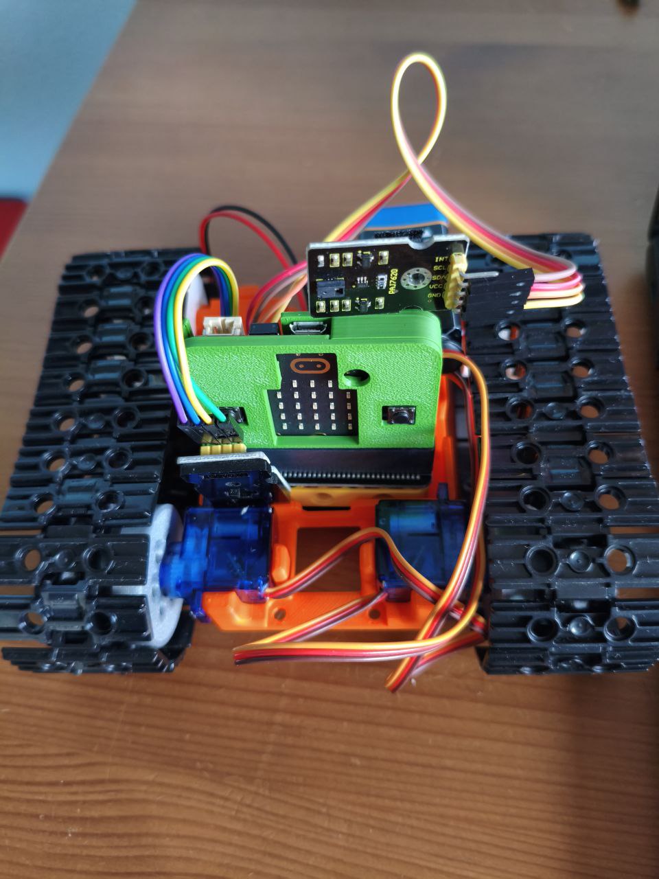 Se basa en un robot oruga con tracción trasera, con dos servomotores de rotación contínua. Todo ello gobernado por una placa micro:bit o microSTEAMakers, con shield de conexionado y alimentación por bateria li-on en formato pila 9V. Como sensores tiene los propios de cada placa y se le han añadido dos sensores con conexionado I2C: sensor de gestos y sensor de color.